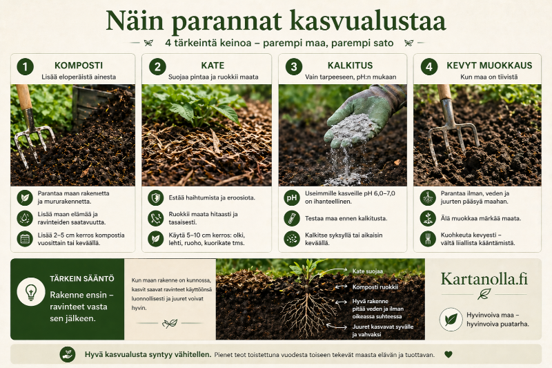 Tämä on kasvualustan parantamisen ydin. Tavoitteena ei ole vain lisätä maahan jotakin, vaan rakentaa maaperään toimintakykyä. Kun maa alkaa toimia itse paremmin, kasvit pärjäävät vähemmällä pakottamisella.