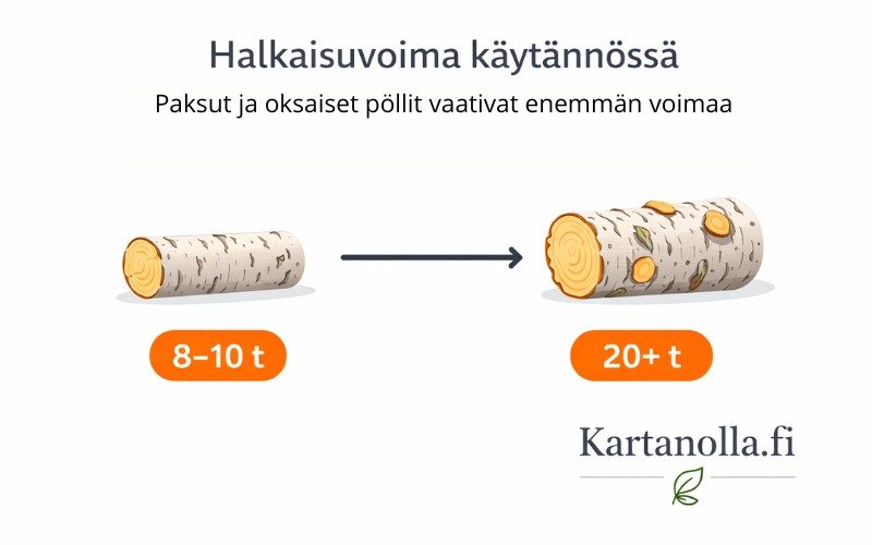 Useimmille kotitalouksille riittää noin 8–12 tonnin halkaisuvoima, jos käsiteltävä puu on pääosin suoraa ja kuivaa. Kun puu on paksumpaa, oksaisempaa tai tuoretta, tarvitaan usein 20 tonnin tai sitä suurempi halkaisuvoima.